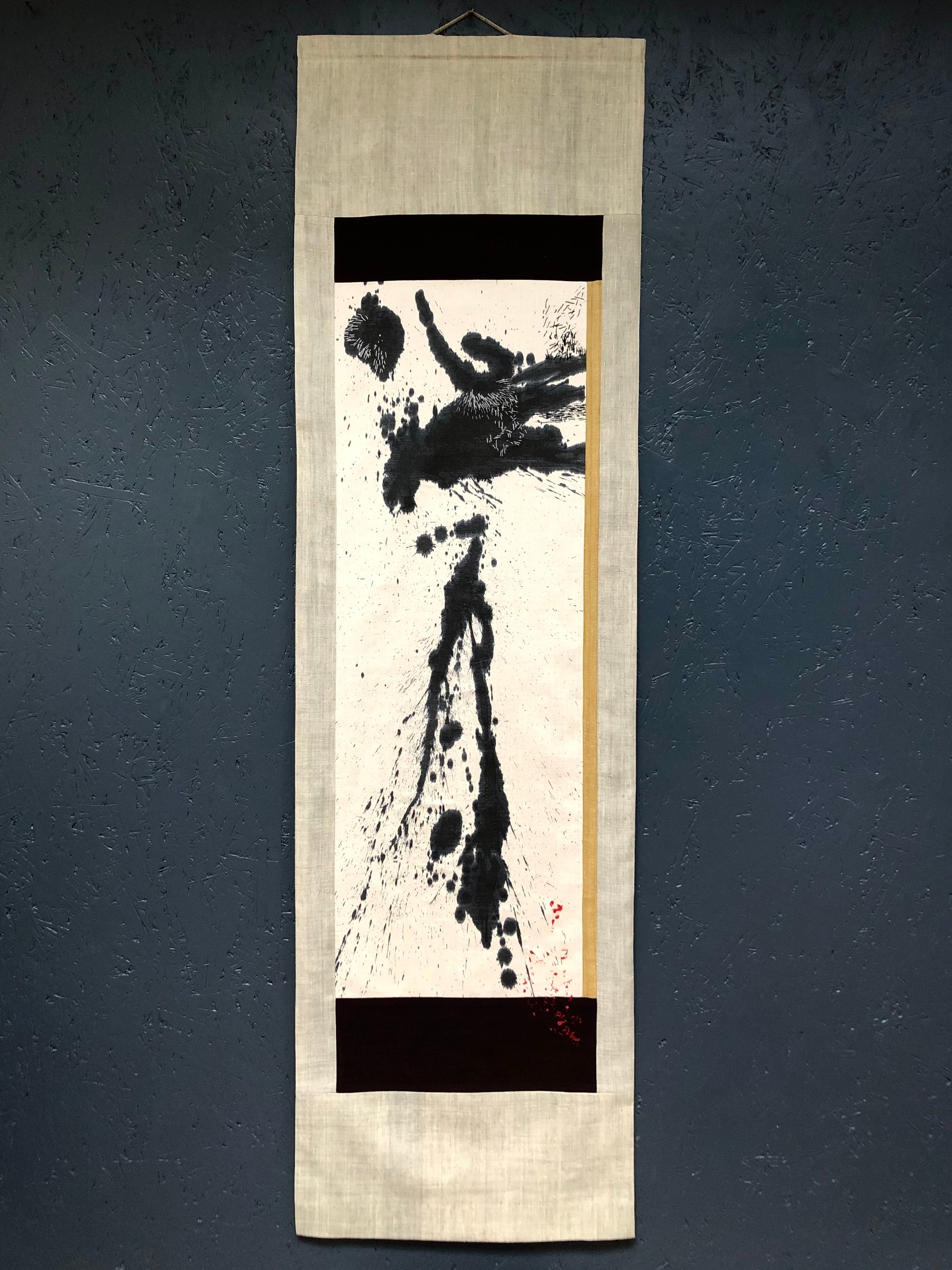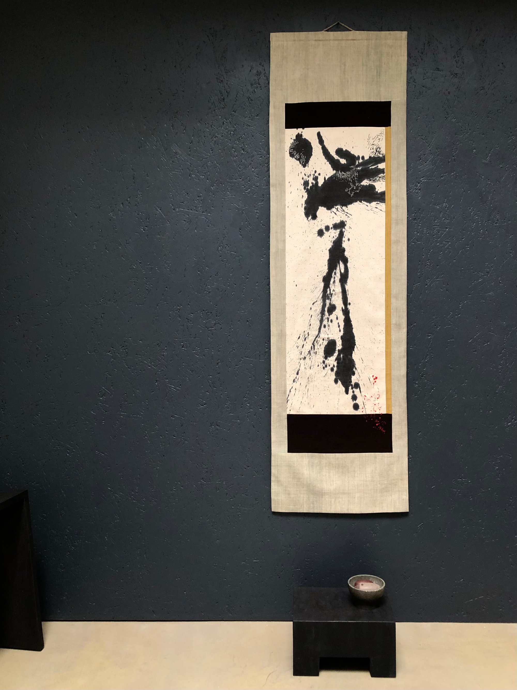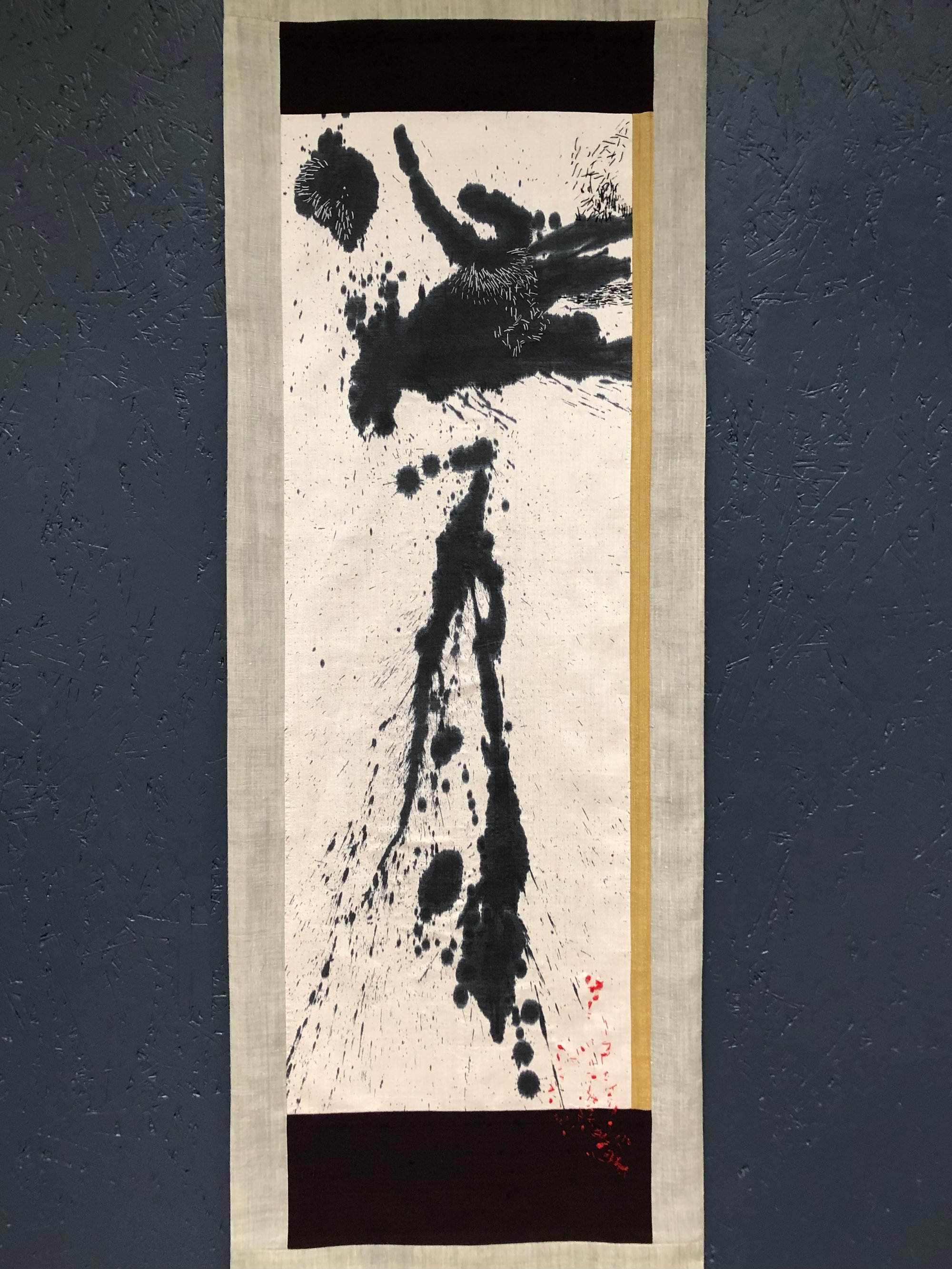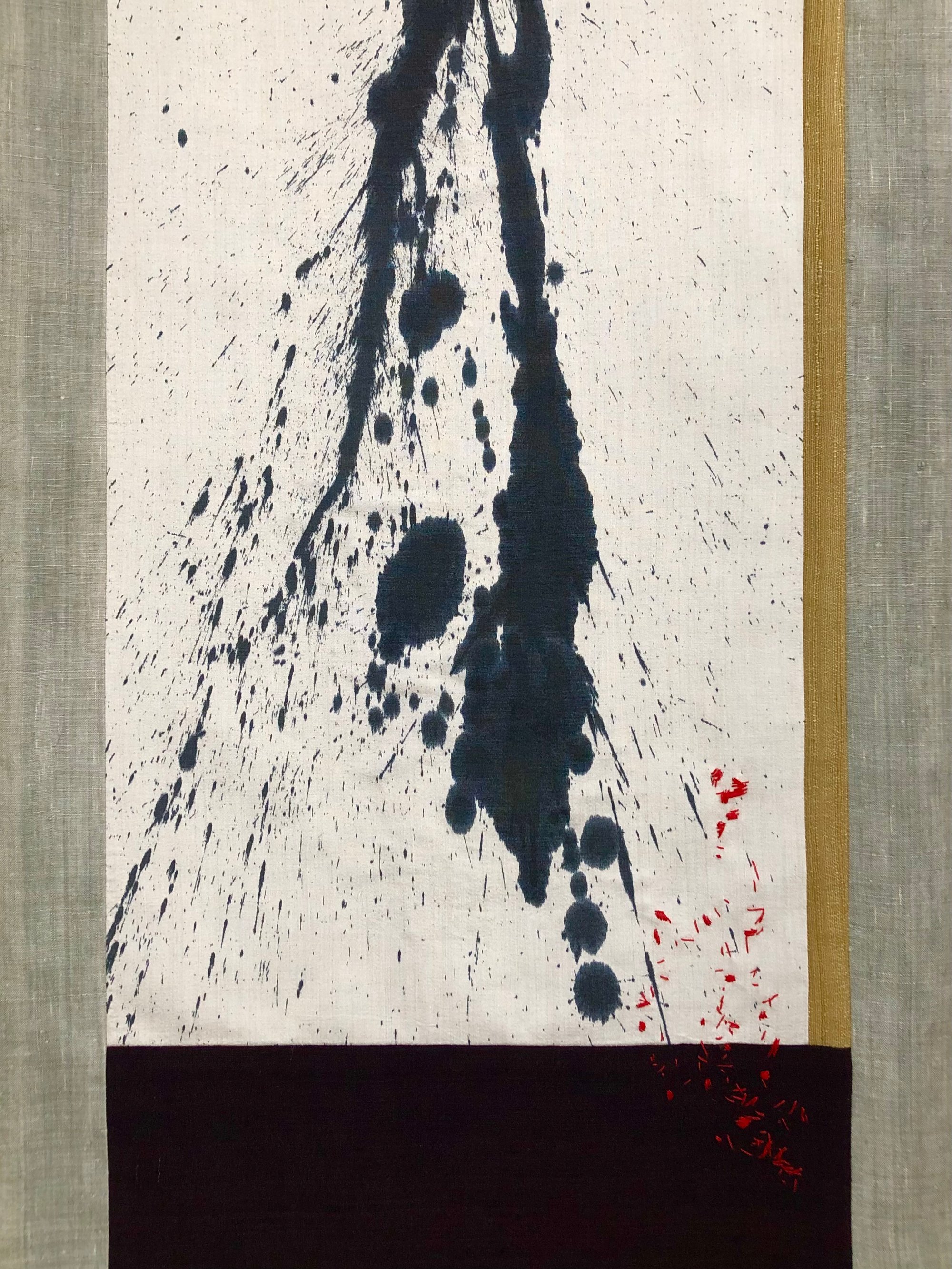 inspired by Japanes kakejiku scrolls, this abstract piece is made from handpainted, handdyed pieces of silk, stitched and embroidered by hand.